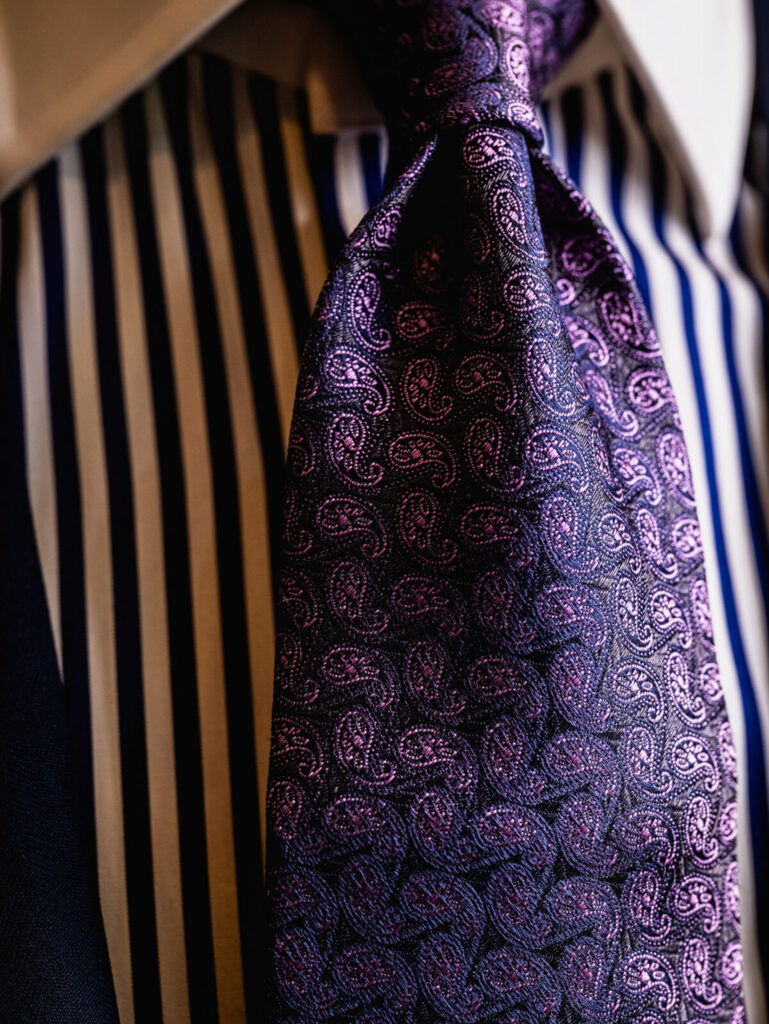 クレリックのロンドンストライプシャツに、ネイビーのヘリンボーンスーツ、そしてこの紫色のペイズリー柄ネクタイを組み合わせると、洗練された印象のコーディネートが完成します。
