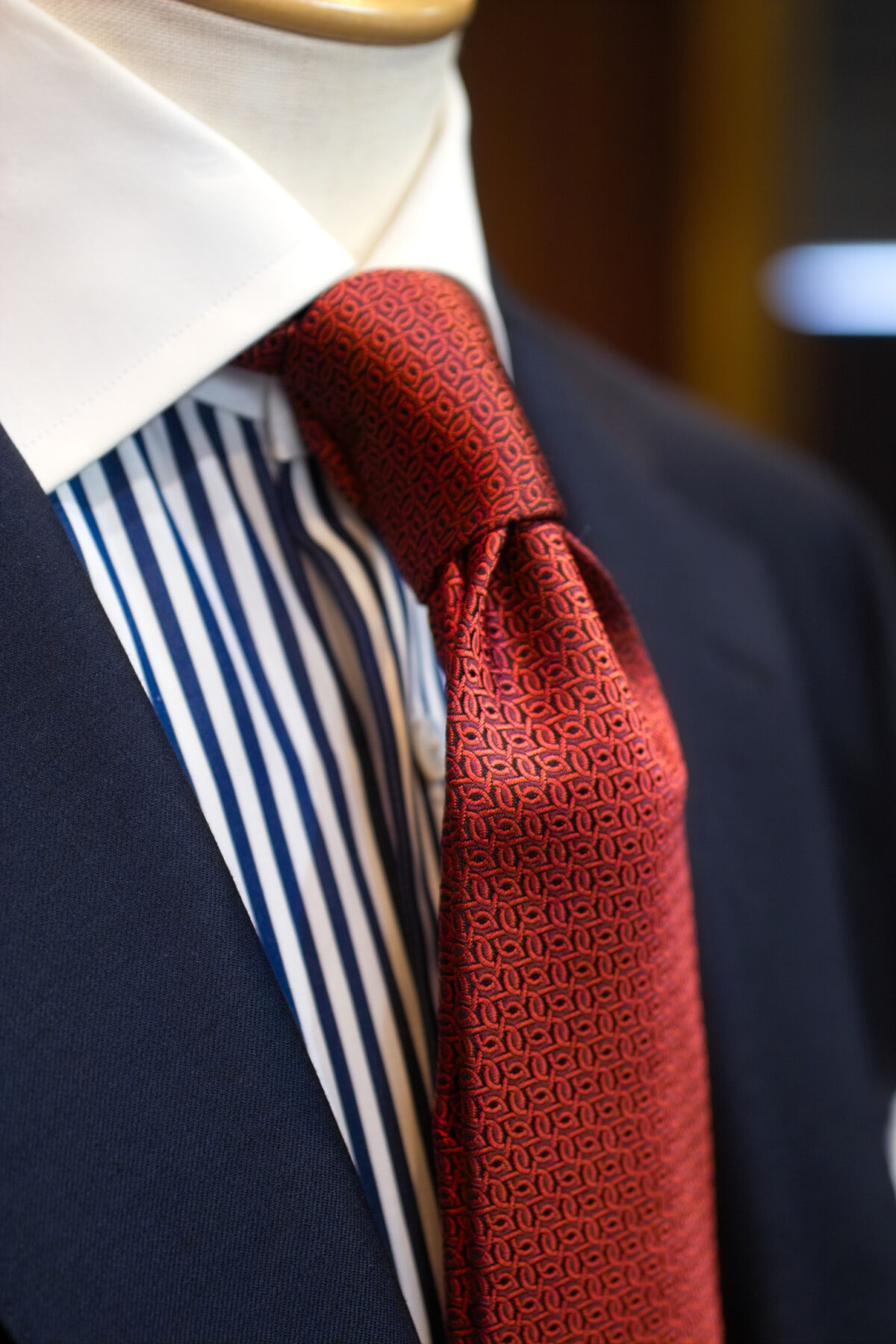ネクタイもドーメル製の一本。深みのある赤に繊細な織り模様が施されており、光の当たり方で表情が変わるのが特徴です。 シンプルながらも、ひと目で「上質」と分かる存在感 を放ちます。