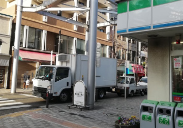 • ファミリーマートの角を右に曲がる。銀色のオブジェが目印です。