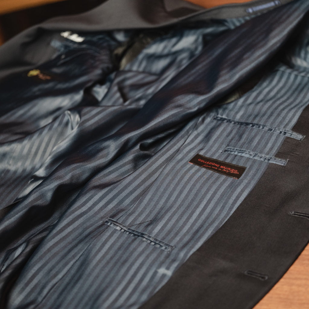 今回の生地はイタリア製MAURIZIOマウリッチョの濃紺無地で仕立てたスーツのオーダー事例