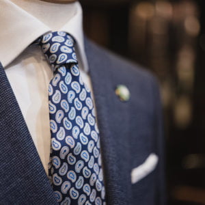 ブルーと白のコーディネートだけでは少し寂しい感じがしたのと、ネクタイのペイズリー柄の緑が綺麗だったので、緑色のブートニエール(衿につけたアクセサリー)で飾りをしました。