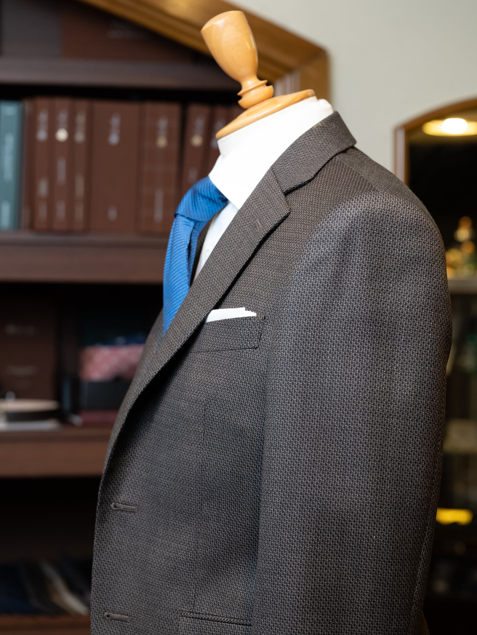 今年で30周年を迎えたDORMEUIL AMADEUS ドーメル アマデウスのコレクションからお選びいただいた茶色の無地の生地で仕立てたスリーピーススーツが出来上がりました。