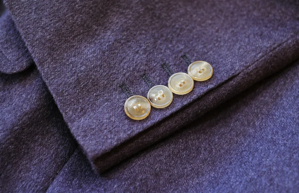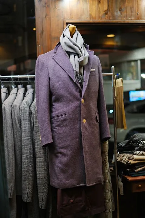 ドーメルのオリジナル裏地や水牛ボタンも見逃せないポイントです。派手過ぎないライトなパープル色。意外と合わせやすいのでぜひご試着してみてください!