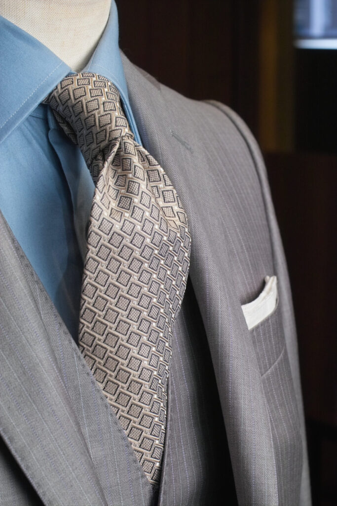 スーツの印象を決める Vゾーン。今回合わせたのは、同じくドーメル製の 幾何学模様のシルクネクタイ です。