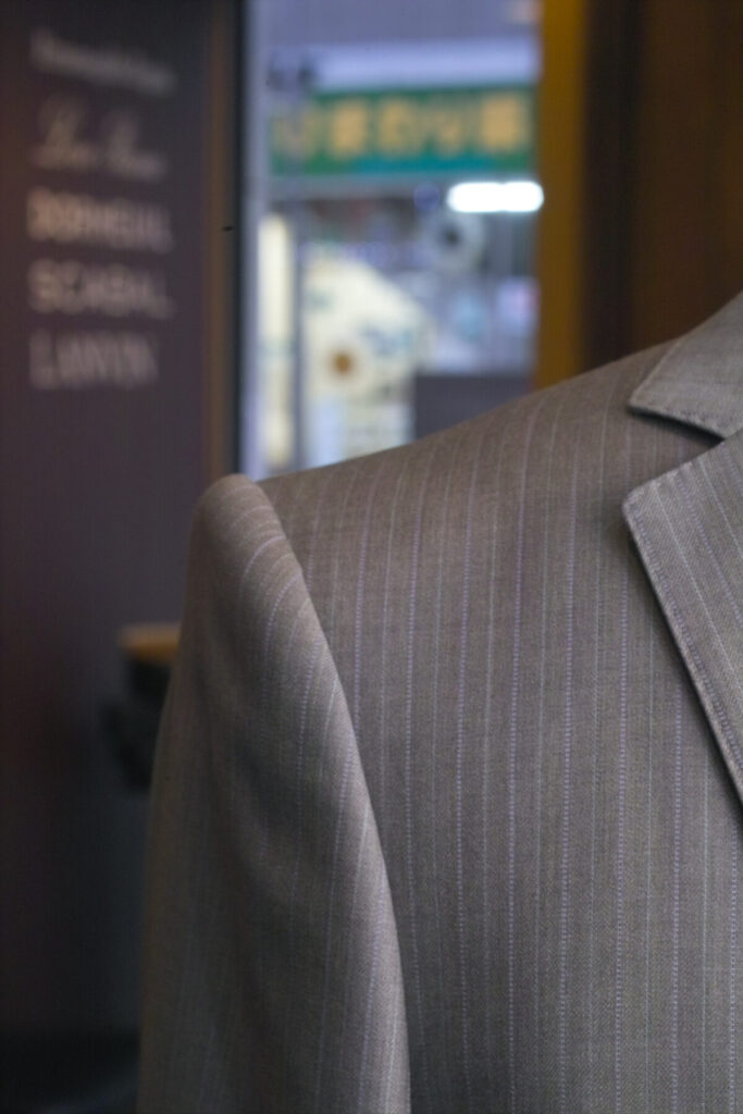 横浜でオーダースーツを仕立てる際、このロープドショルダーを取り入れることで、クラシックな英国調のシルエットを強調しながらも、フランス的な洗練さを感じさせるスタイルが完成します。