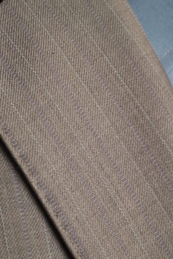 今回使用したスーツ生地は、ライトグレーのカラーストライプ。控えめながらも、角度によってさりげなく光を反射し、繊細な奥行きを生み出します。ビジネスシーンにふさわしい落ち着きのある色合いながら、硬すぎず柔らかな雰囲気を持っているのが魅力です。