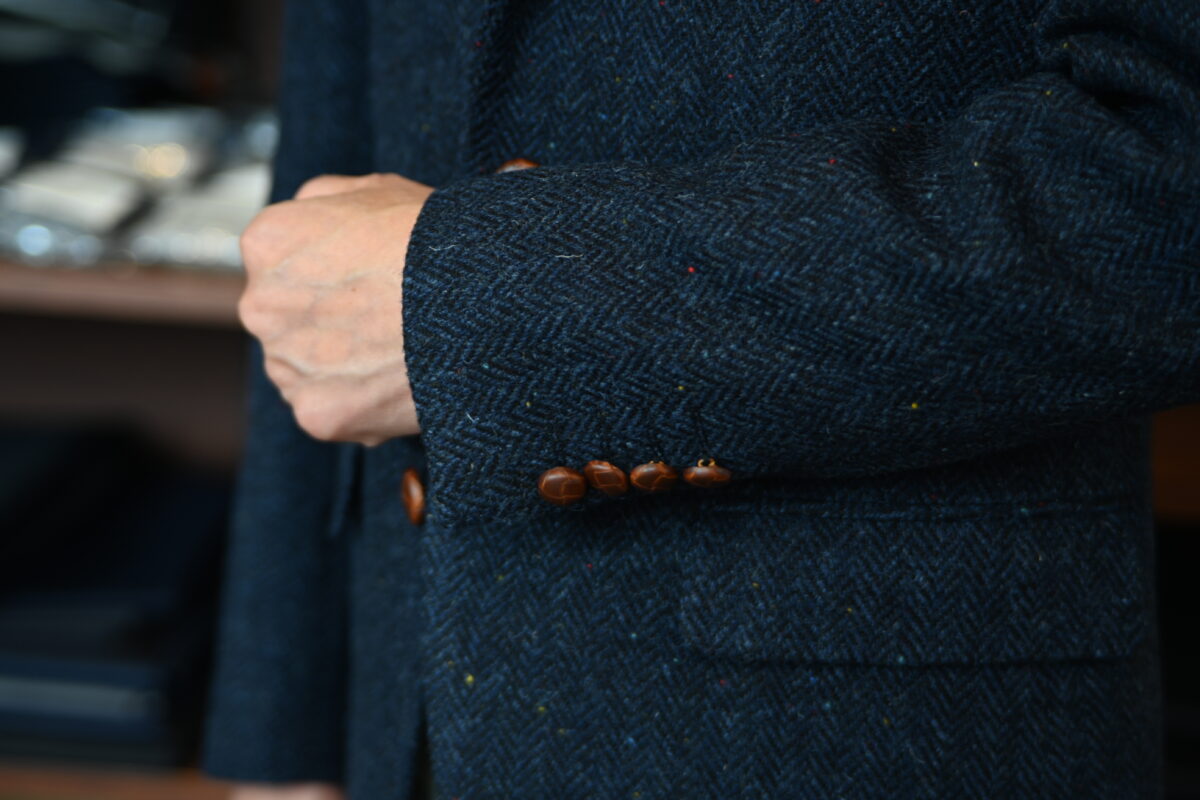 明るいブラウンのレザー釦が、今回の生地と相性抜群です。