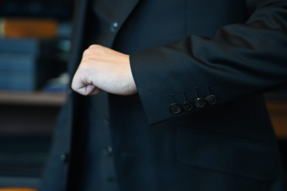 シンプルな無地のスーツでありながら、高級感とこだわりを感じさせる1着ですね。
