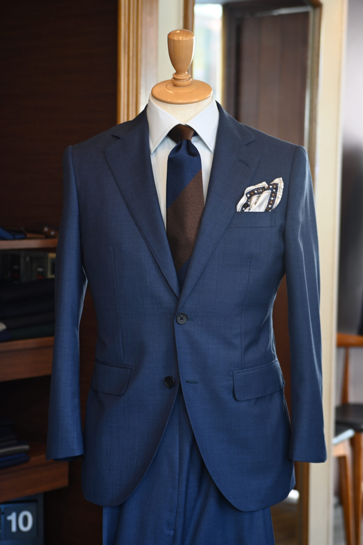 写真はブルーグレーの生地ですが、ベーシックな濃紺の無地ですと、就職活動や、就職してからも使い勝手が良いですね。