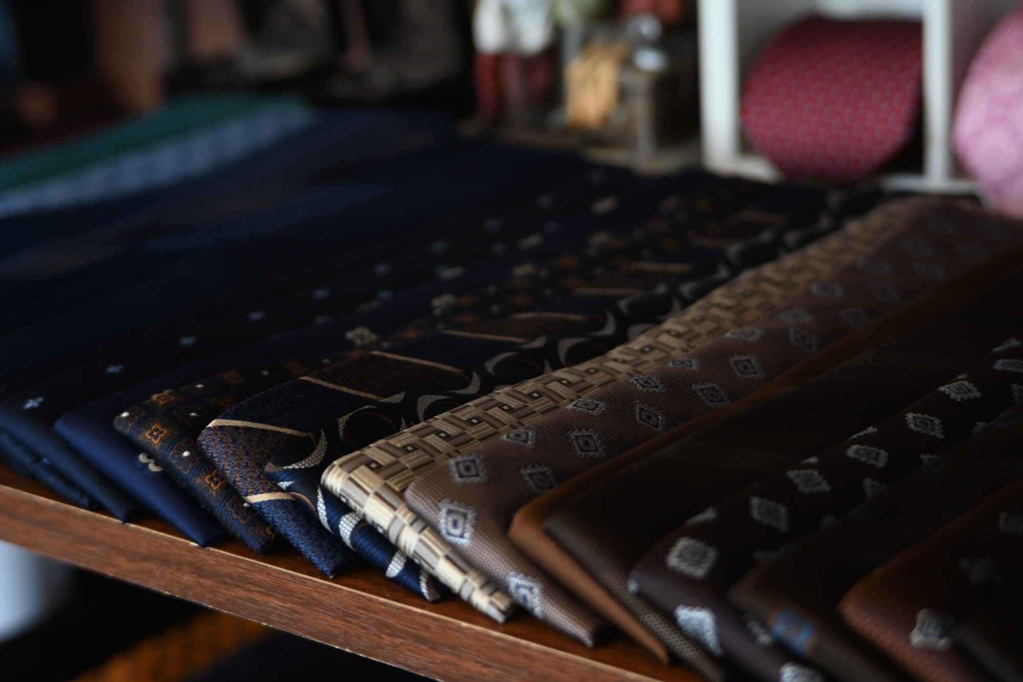 今回入荷したネクタイは、インポートの生地を使用し、国内で縫製されたものと、京都の西陣織のものです。