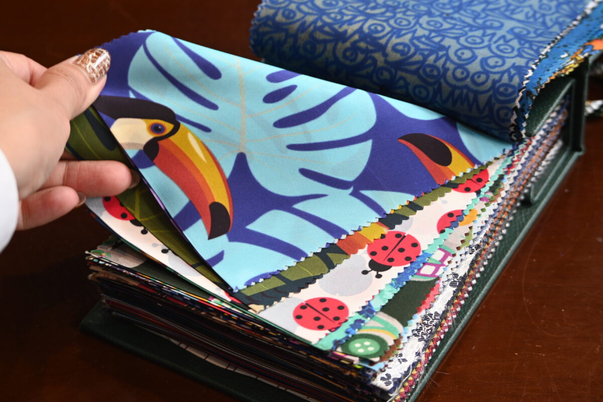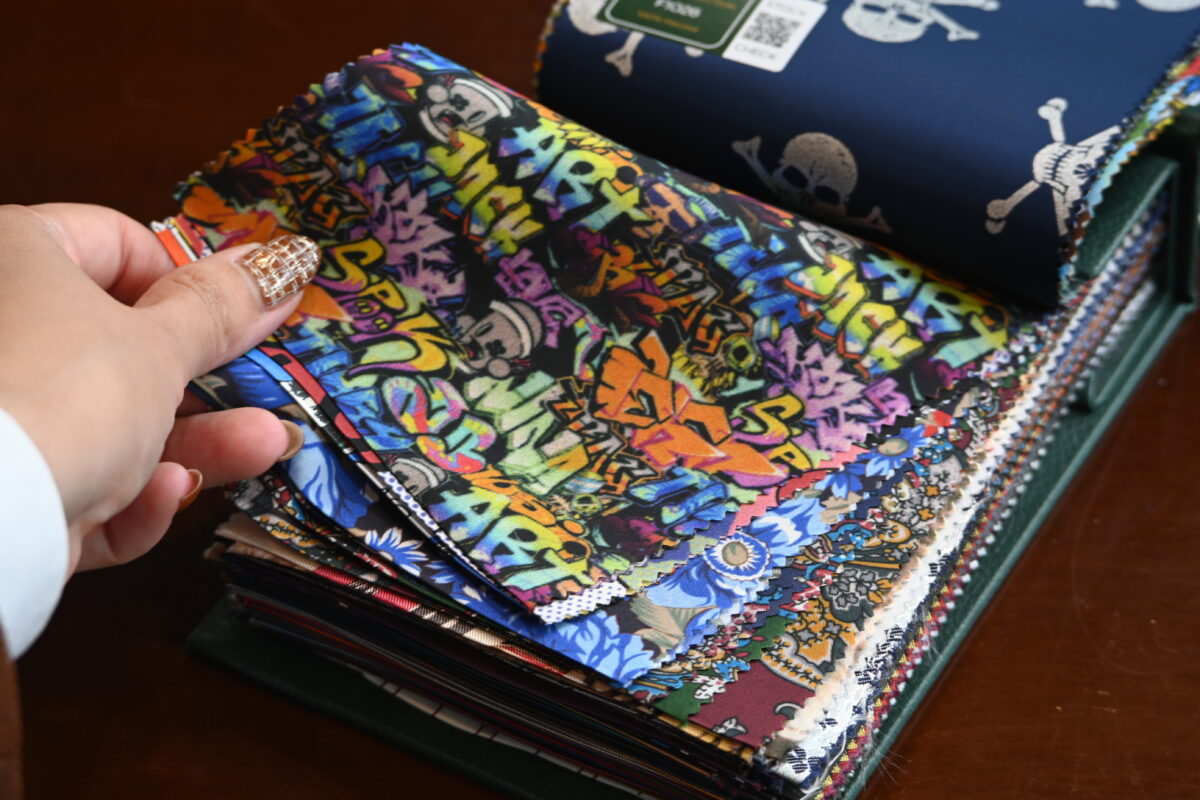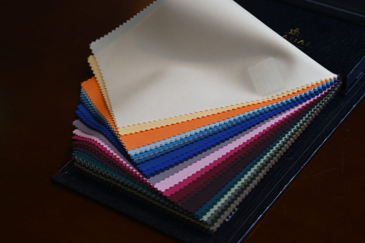 基本的に一般ビジネスマンのお客様がメインなので、仕上がり品のご紹介の際も落ち着いた生地が多いのですが、こういった派手な色味の生地もたくさんご用意しております。