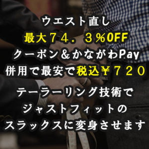 通常スラックスのウエスト詰めはウエスト&ヒップ調整で¥2,546(税込¥2,800)ですが、期間中は半額の¥1,273(税込¥1,400)で承ります!