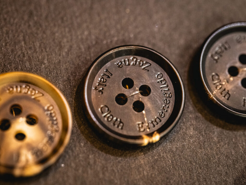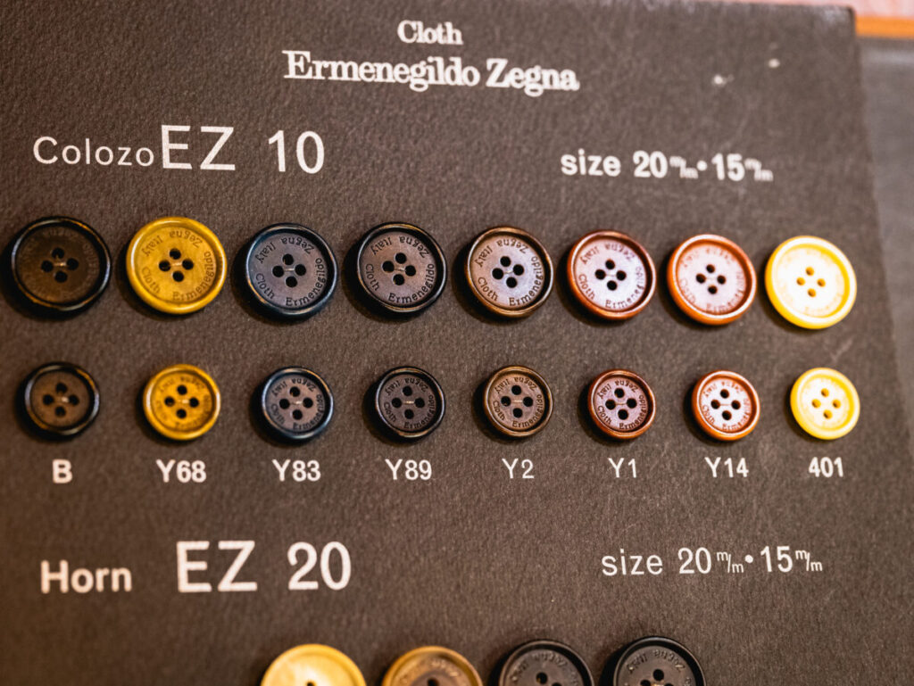 通常、イタリア本国から取り寄せるゼニアのスーツには専用裏地&釦が標準装備ですが、フェア商材の場合、