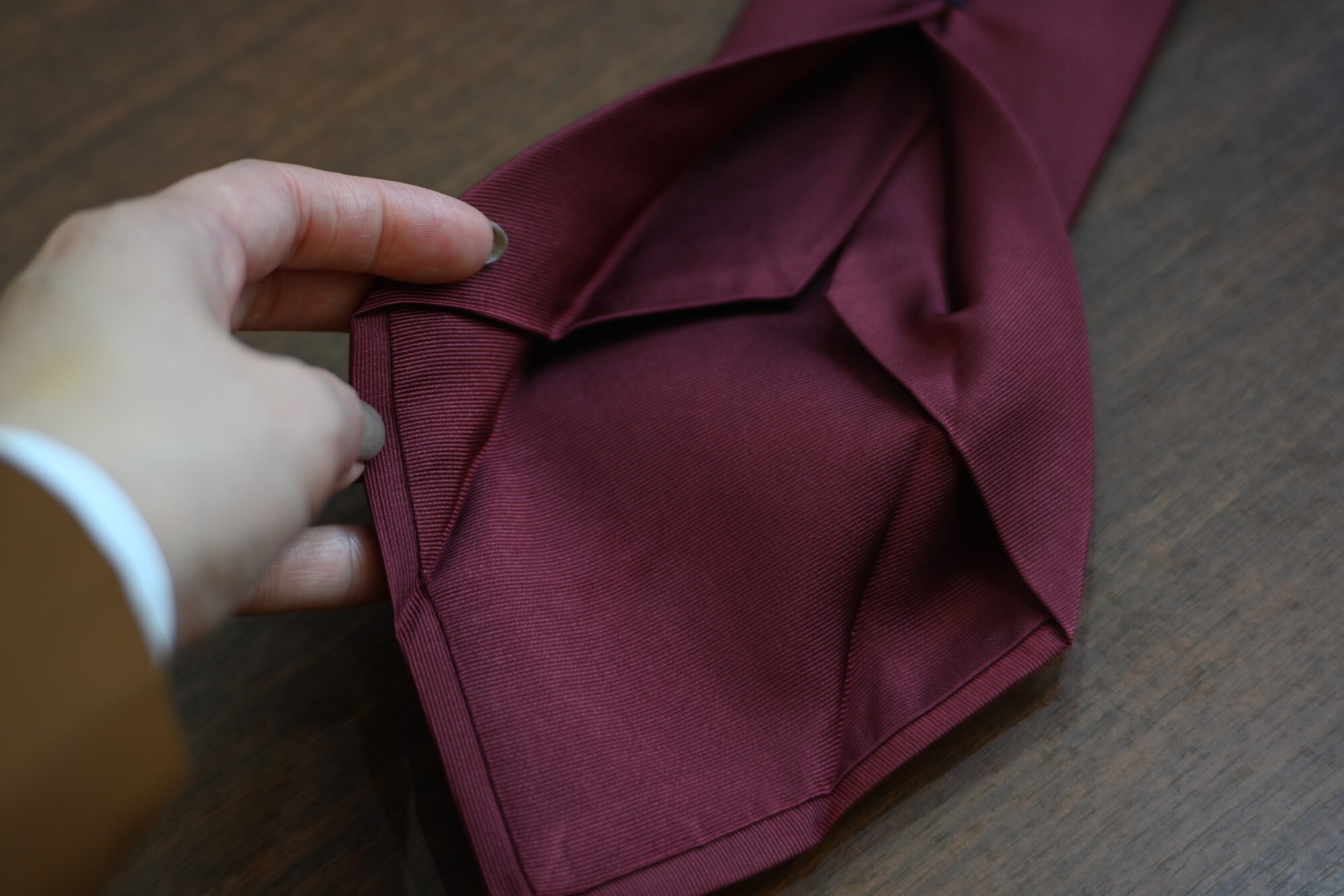 通常の2倍の生地を要する『セブンフォールズ』に加え、裏地まで共生地の『セルフティッピング』。